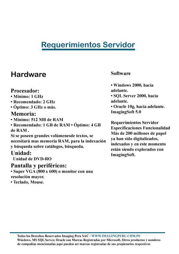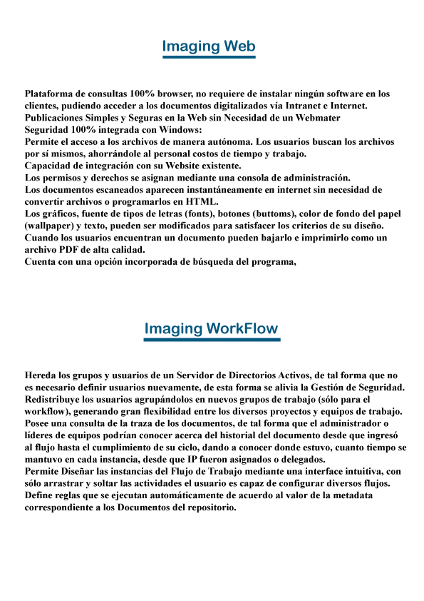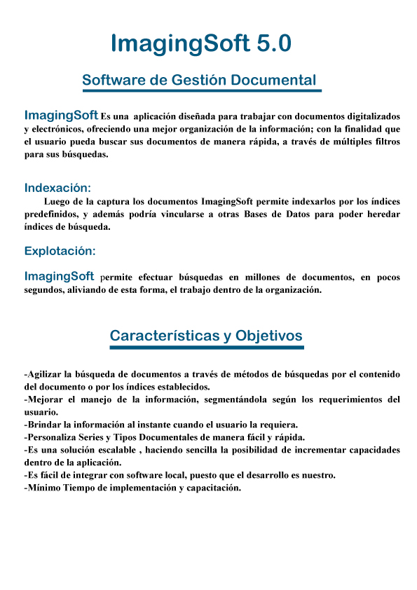 ImagingSoft es una aplicación diseñada para trabajar con documentos digitalizados y electrónicos sin la necesidad de acudir a múltiples bases de datos u hojas de calculo. Mejora el manejo de la información, segmentándola según los requerimientos del usuario y brinda la información al instante cuando el usuario la requiera.Para mas informacion seleccione
