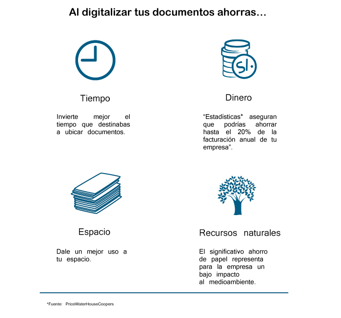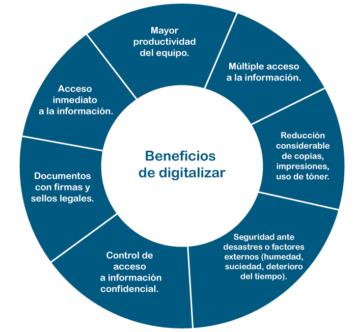 Este proceso transforma documentos físicos en imágenes digitales, las cuales almacenamos y organizamos para que tengan un almacenamiento seguro, de fácil acceso y un manejo efectivo; a la par, de un considerable ahorro de costos.